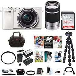 - BUNDLE INCLUDES - Sony Alpha a6000 Mirrorless Camera w/ 16-50mm Lens / 55-210mm Lens / 128GB SD Card / 2 Batteries & Charger / Tiffen UV Filter / Focus Bag, Spider Tripod, Cleaning Kit, Lens Pen, Card Reader, Wrist Grip Strap, Lens Band & HDMI Cable