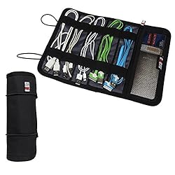 - The elastic loops can hold the wires together. It rolls up and comes with two drawstrings that will keep it closed if you toss it in a purse or backpack